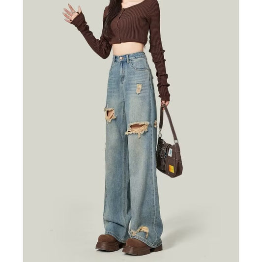 European And American Style Retro Washed Distressed Wide Leg Jeans